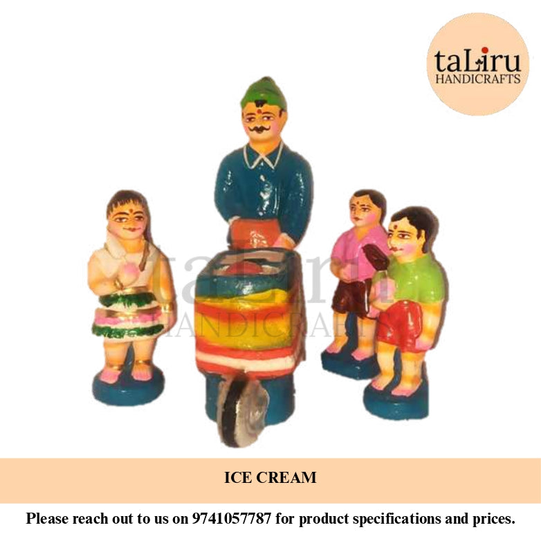 Delight your display with the playful Ice Cream doll set, featuring vendors and children enjoying sweet treats. This fun and modern addition brings vibrance, joy, and a touch of contemporary charm to your traditional Golu steps.