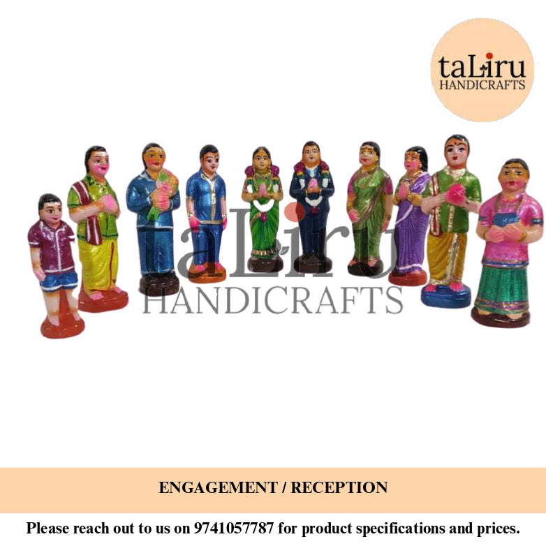 Add grandeur and festivity to your display with the Wedding Reception doll set, showcasing the joyful celebrations following a traditional marriage. With bride, groom, guests, and music, this set radiates cultural richness and makes your Golu come alive with festivity.